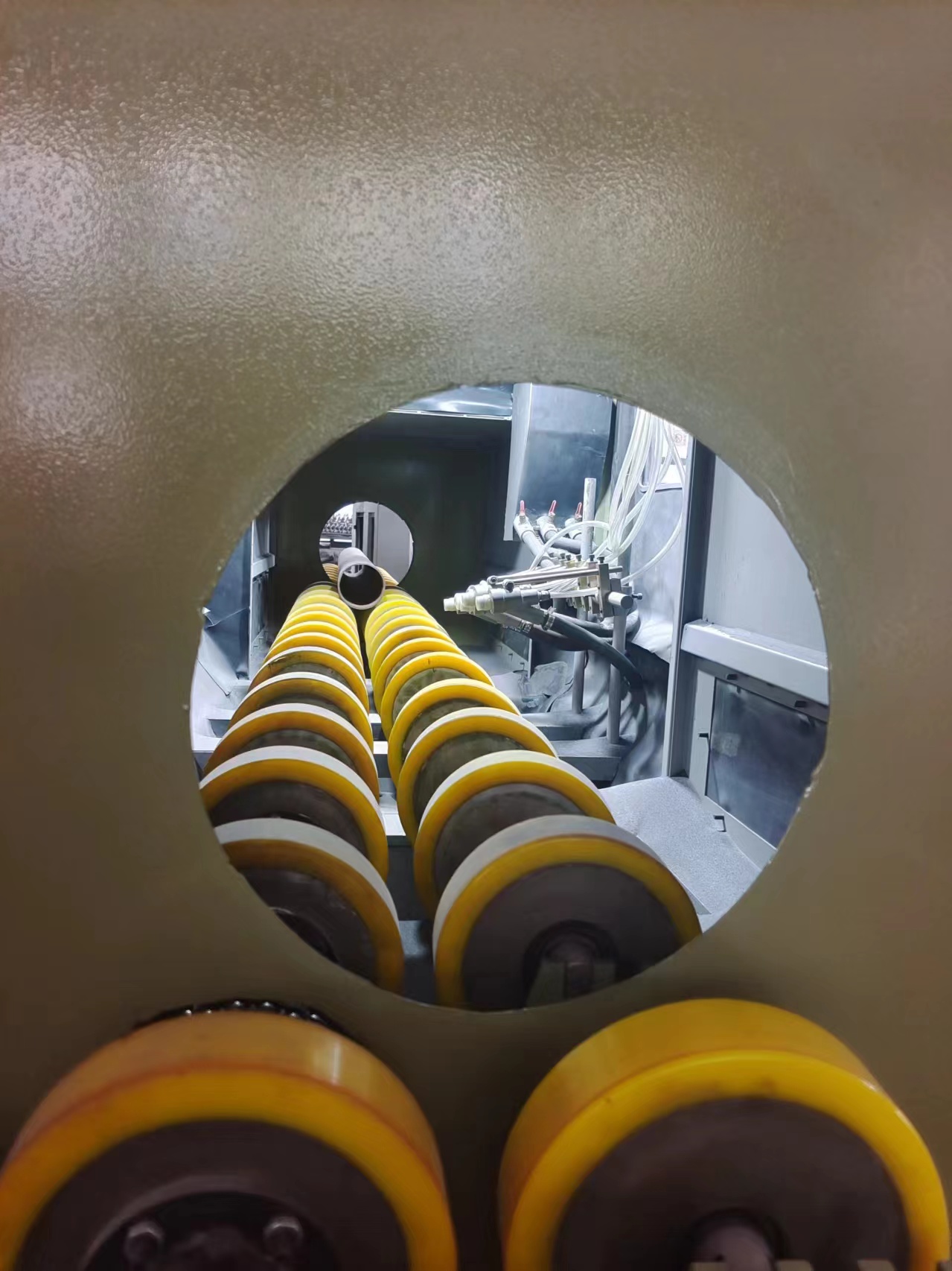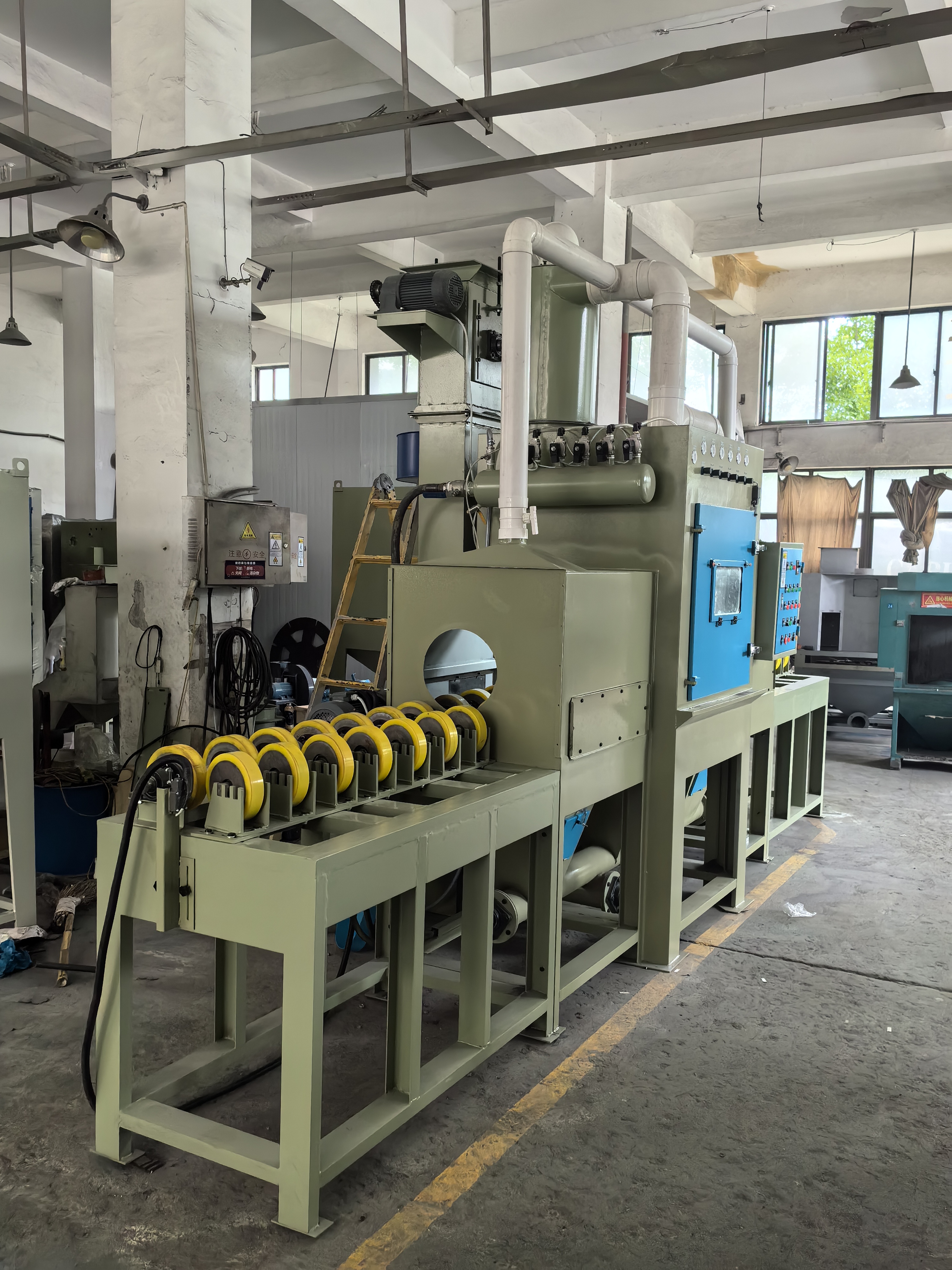 本類機(jī)型適用于,管件,輥軸類圓柱形工件的表面處理噴砂工藝。 材質(zhì)不限如:鐵管、
